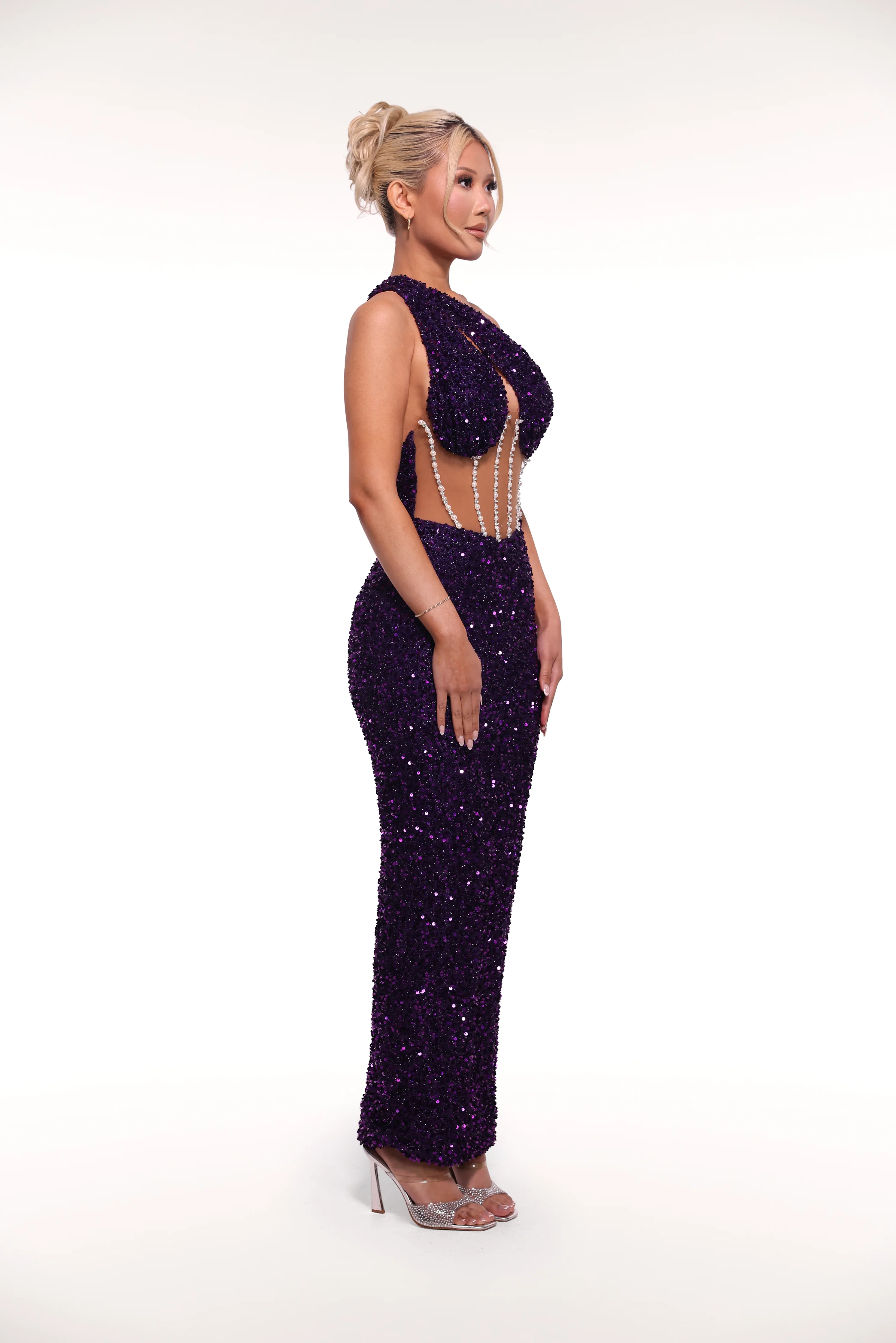 'Athena' is made from a stretchy sequin fabric. It has a V-line silhouette tapered down hugging the body with a beaded mesh corset that cinches the waist.