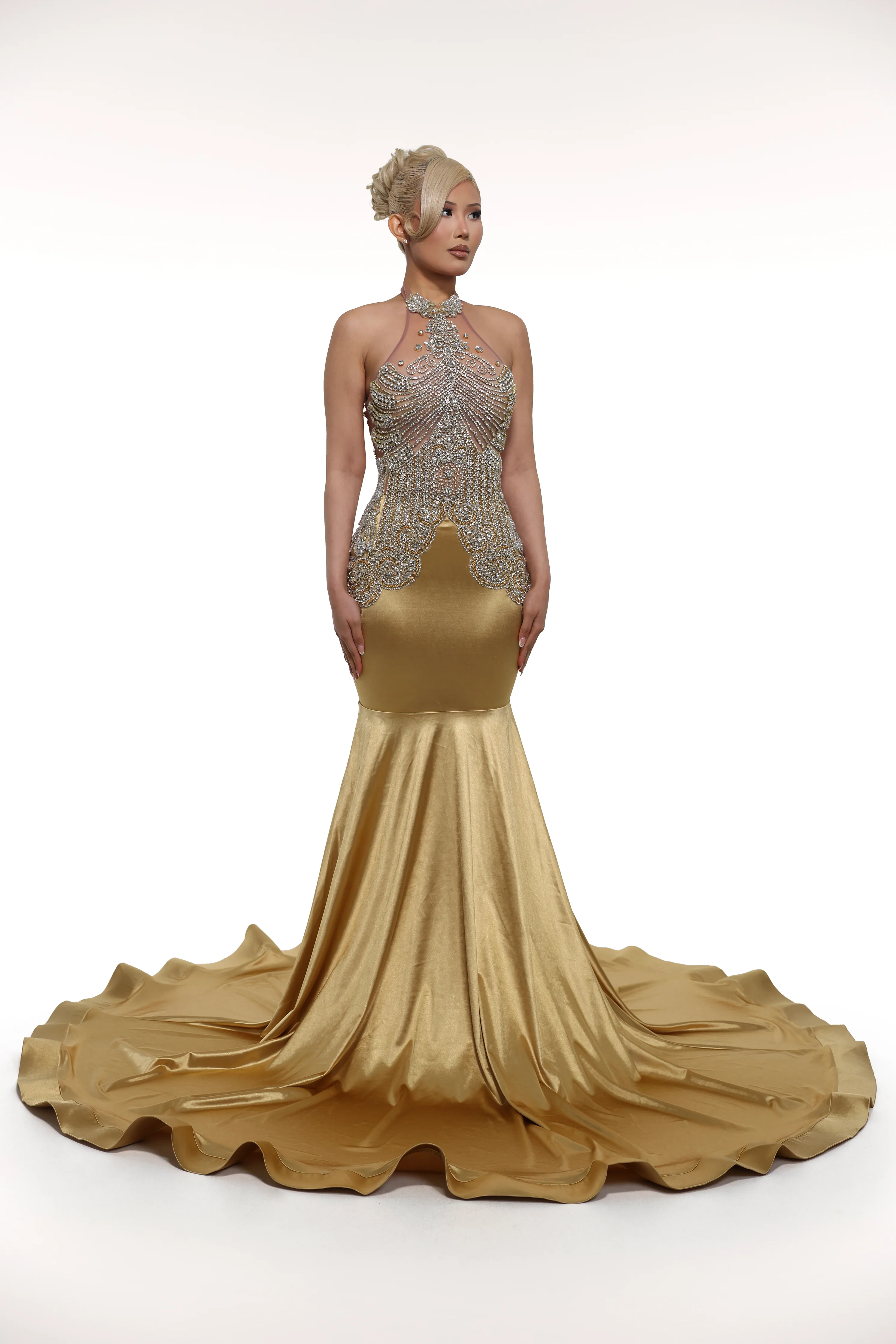 This 'Azeh' high-neck open-back prom gown is crafted from a satin fabric with a stretchy fit for maximum comfort. The intricate rhinestone appliqués covering the chest and waistline add a touch of glamour and compliment the hips