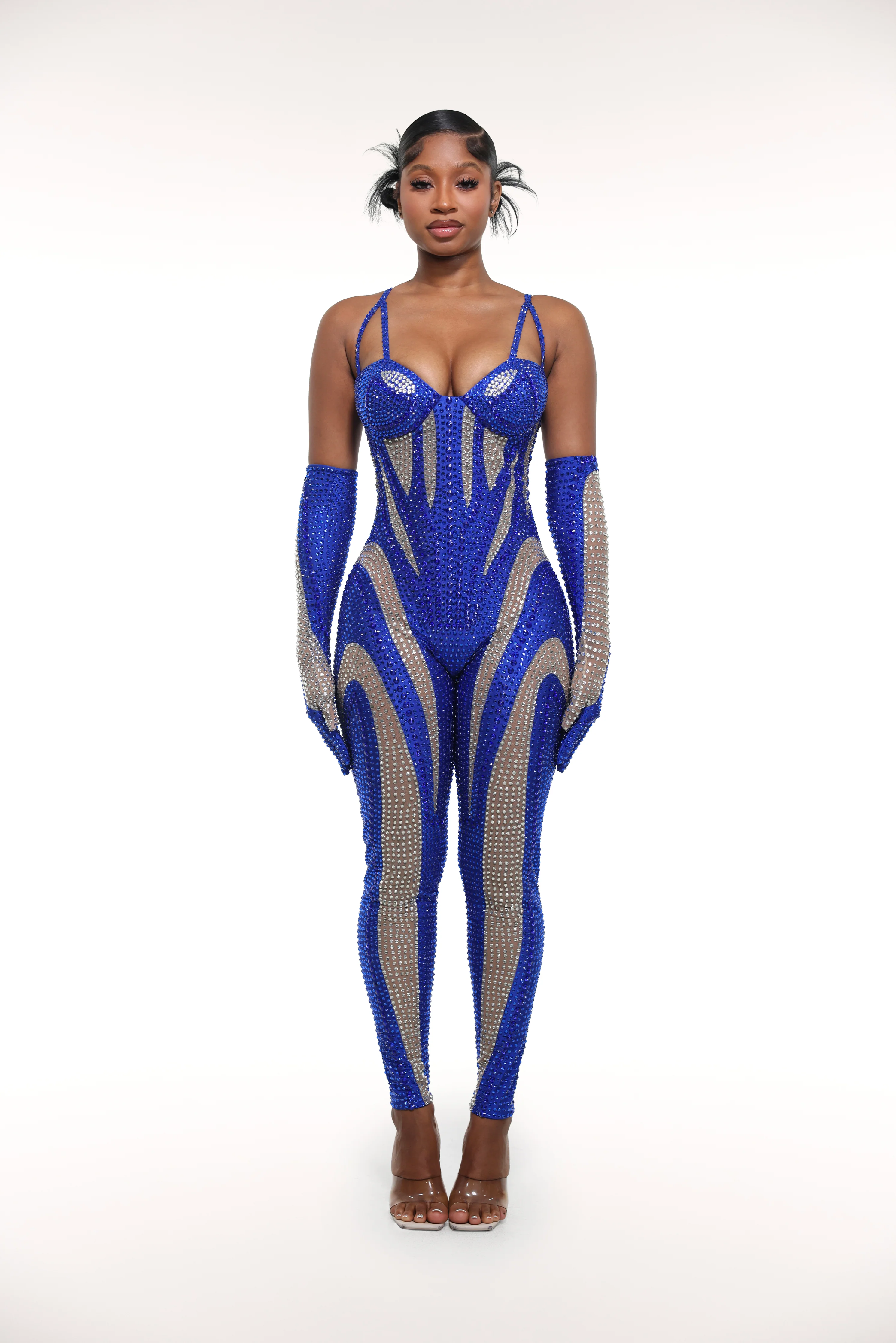 Introducing 'Bust Down', the epitome of elegance and luxury. This stunning silver and black rhinestone jumpsuit is adorned with delicate gloves, perfect for any red carpet event.