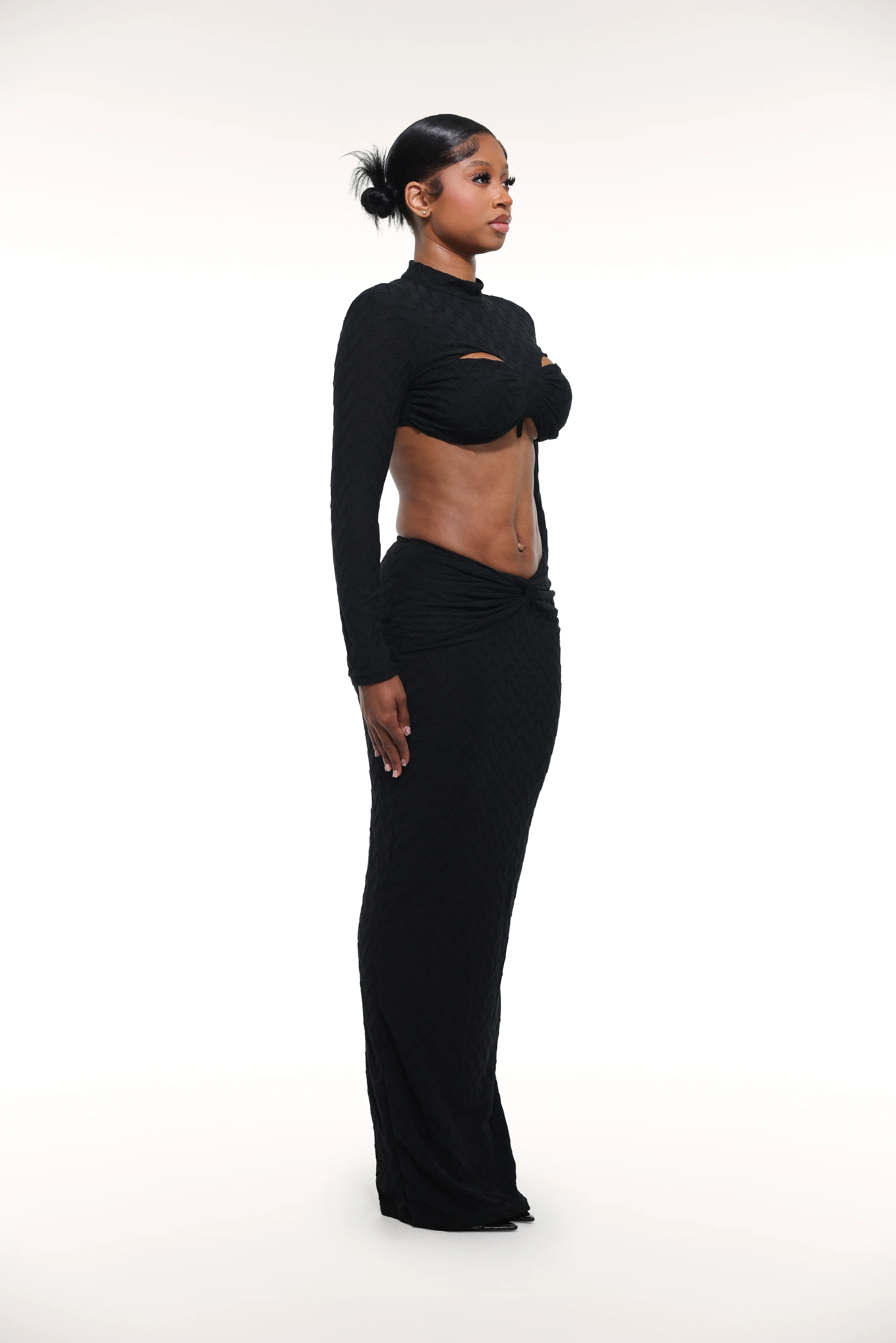 Dress to impress in our 'Dove Set'. Featuring a two-piece bralet and high neck styled long-sleeve top with a sexy cut out design, this set is sure to turn heads. The skirt is designed with a scrunch at the waist line and made from a patterned fabric, adding a touch of sophistication.