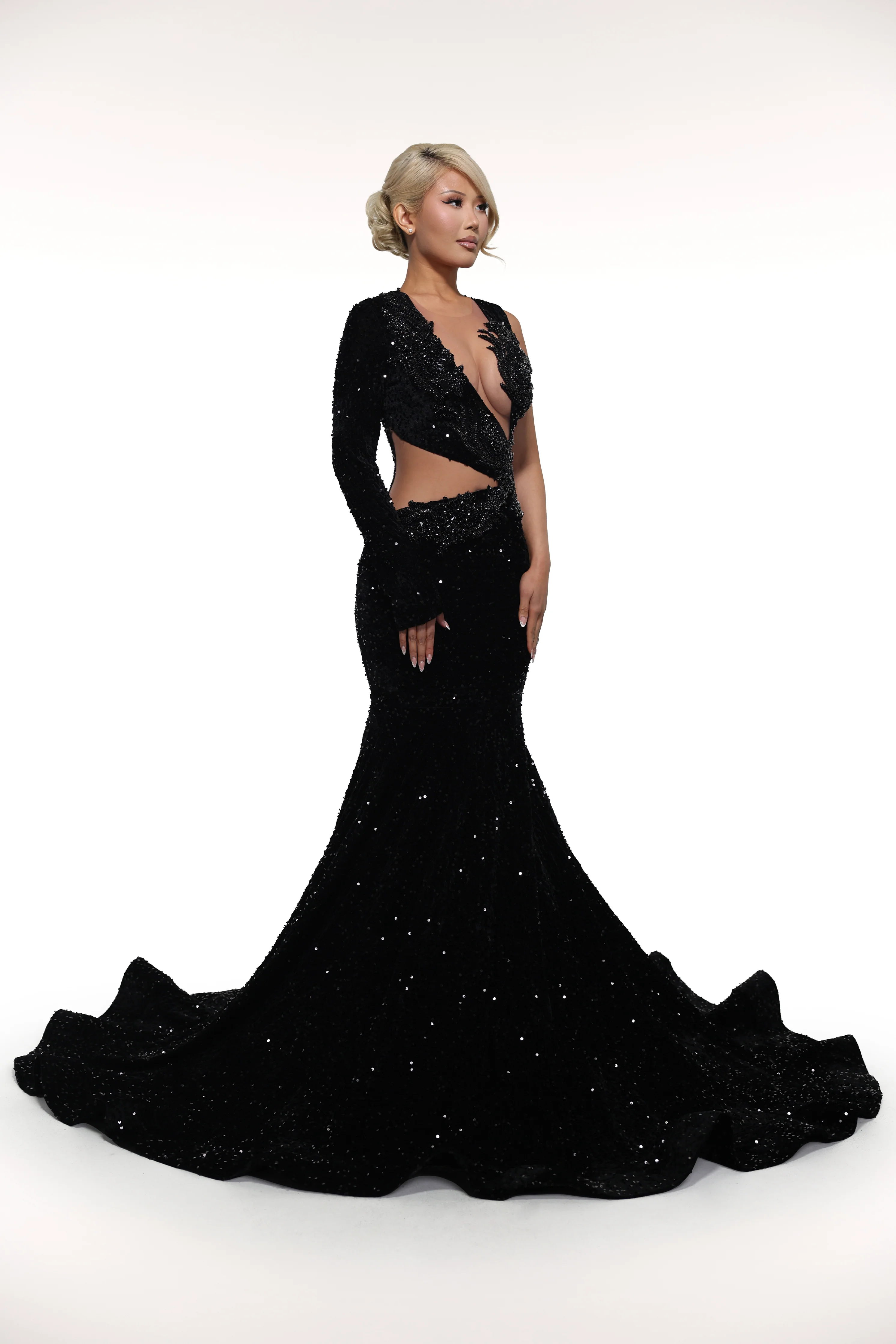 'Draessa' enhances your elegance with a one-sleeve velvet sequin prom gown. Combining mesh long sleeves with matching appliqués, this dress features a plunging mesh-lined opening at the bust, perfect for a glamorous and chic look.