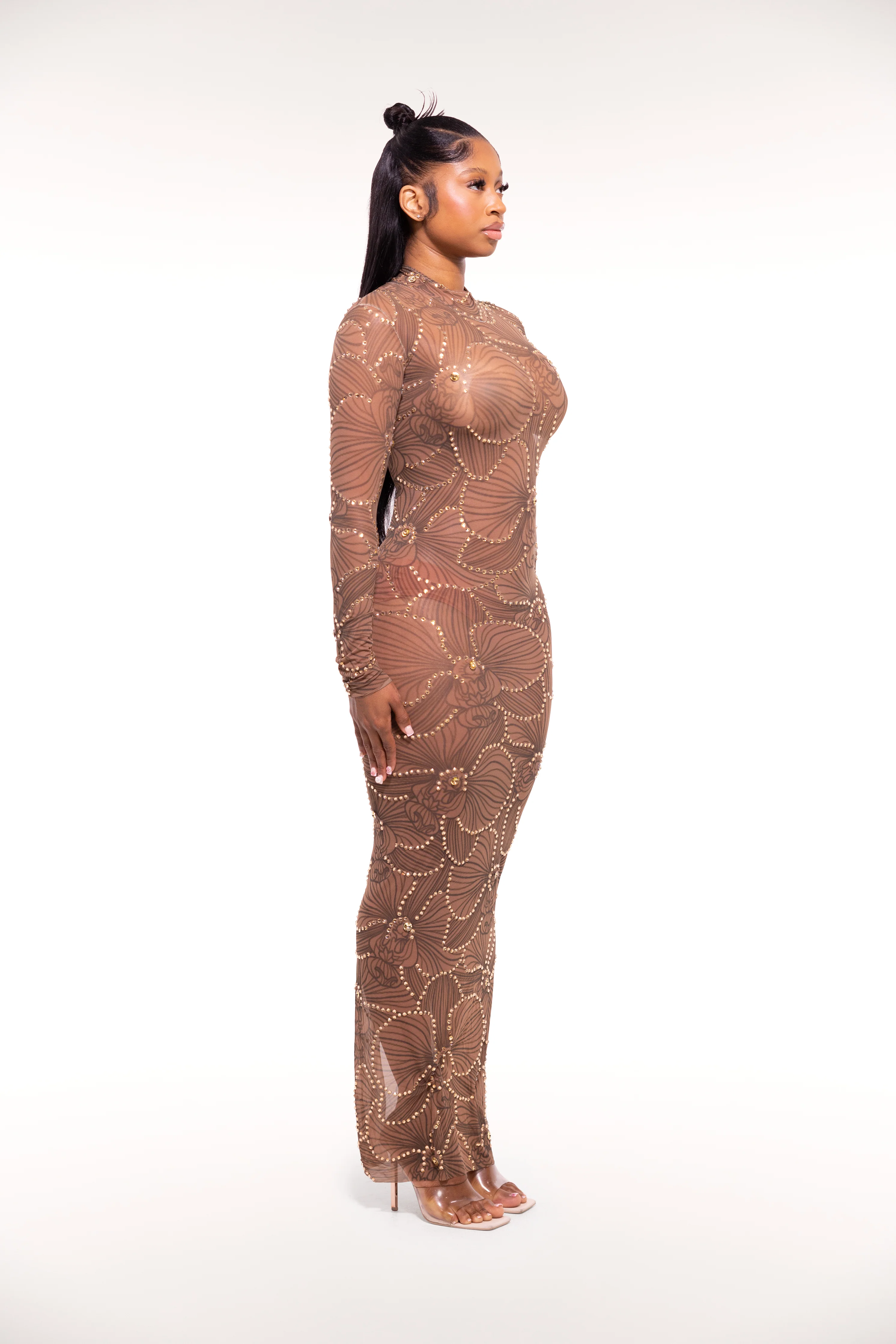 Expertly crafted for a graceful look, our 'Flower Dust Evening Gown' wraps you in a delicate mesh fabric adorned with a beautiful floral print. Elegant long sleeves and a high neck add a touch of sophistication while glistening crystals subtly enhance the dress.