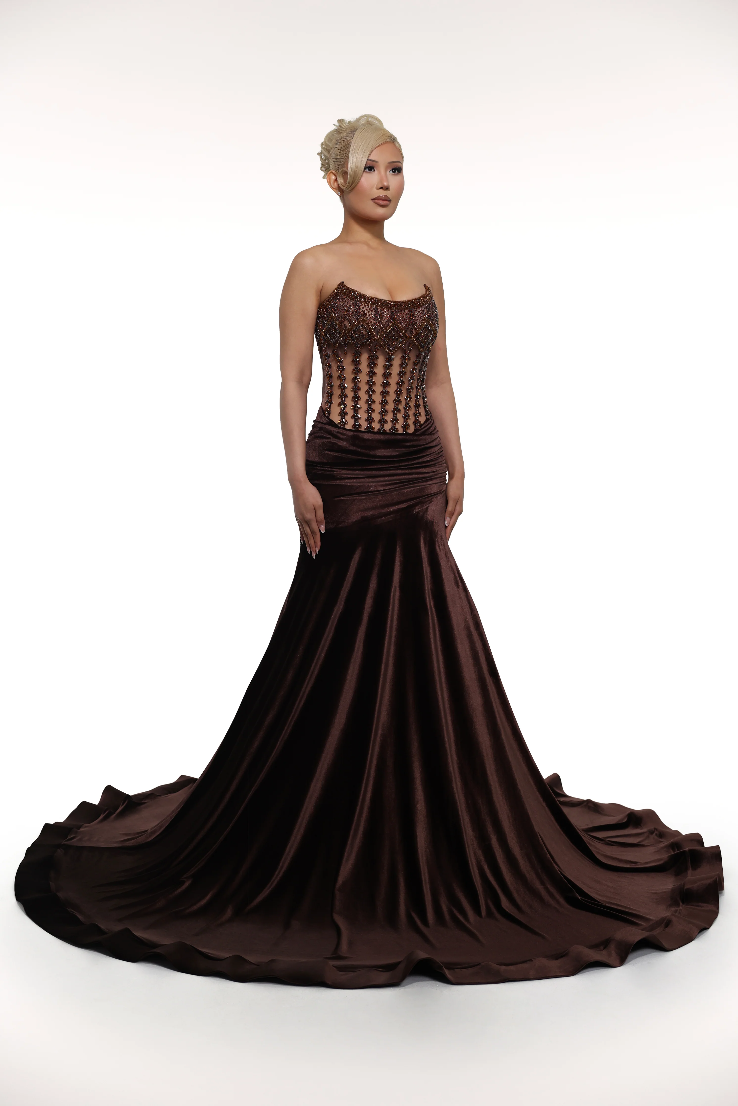 Upgrade your wardrobe with the new 'Fabia' dress. Featuring a strapless design and detail along the bust, this dress is made with stretchy velvet fabric for a comfortable fit. The corset-style bust is adorned with sparkling rhinestones, adding a touch of glamour to any occasion.