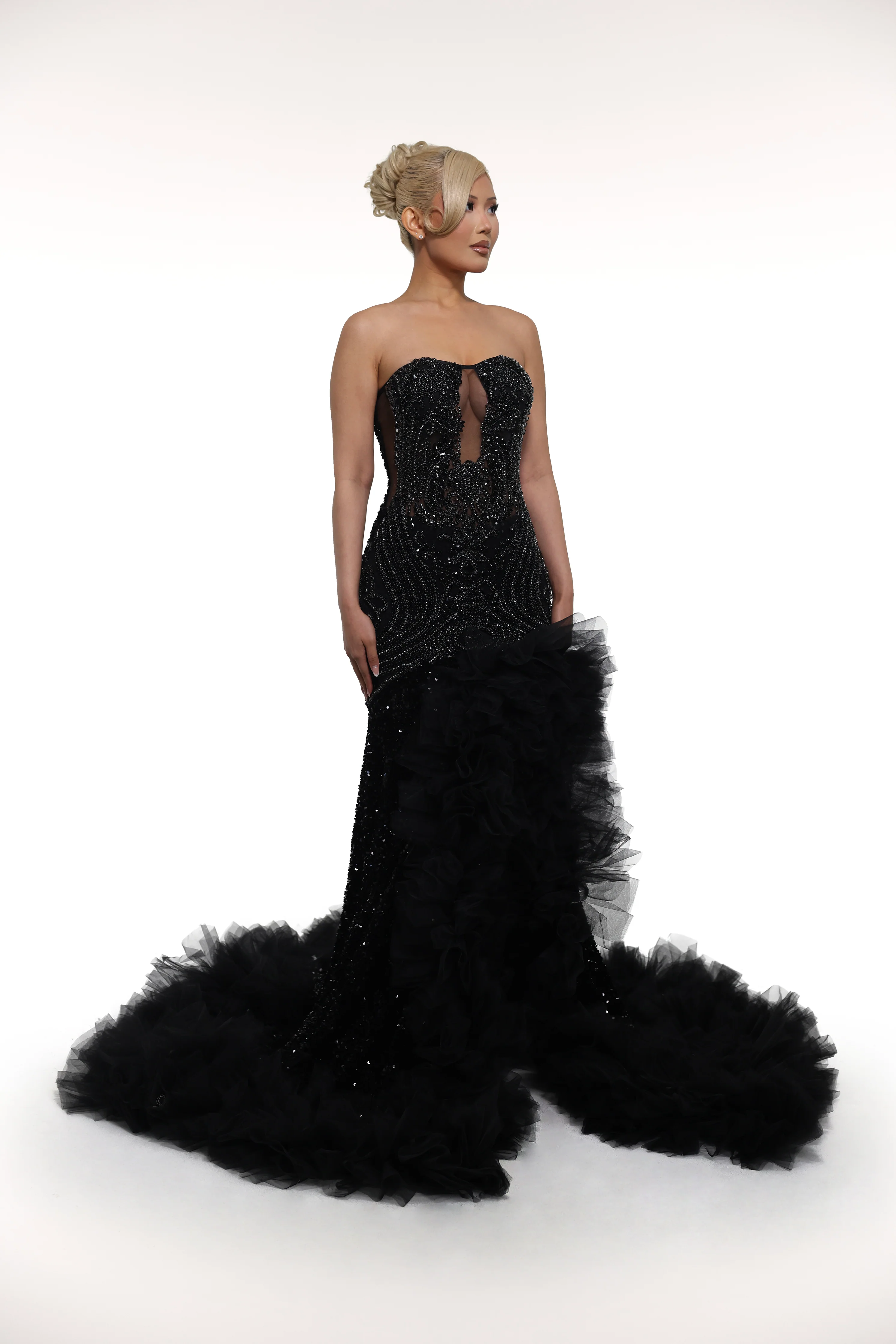 'Morwen' showcases an ornate mesh bodice paired with a supportive stretch back, crowned by a voluminous floor-length skirt with cascading ruffles. A statement piece designed for those who embrace dramatic elegance.