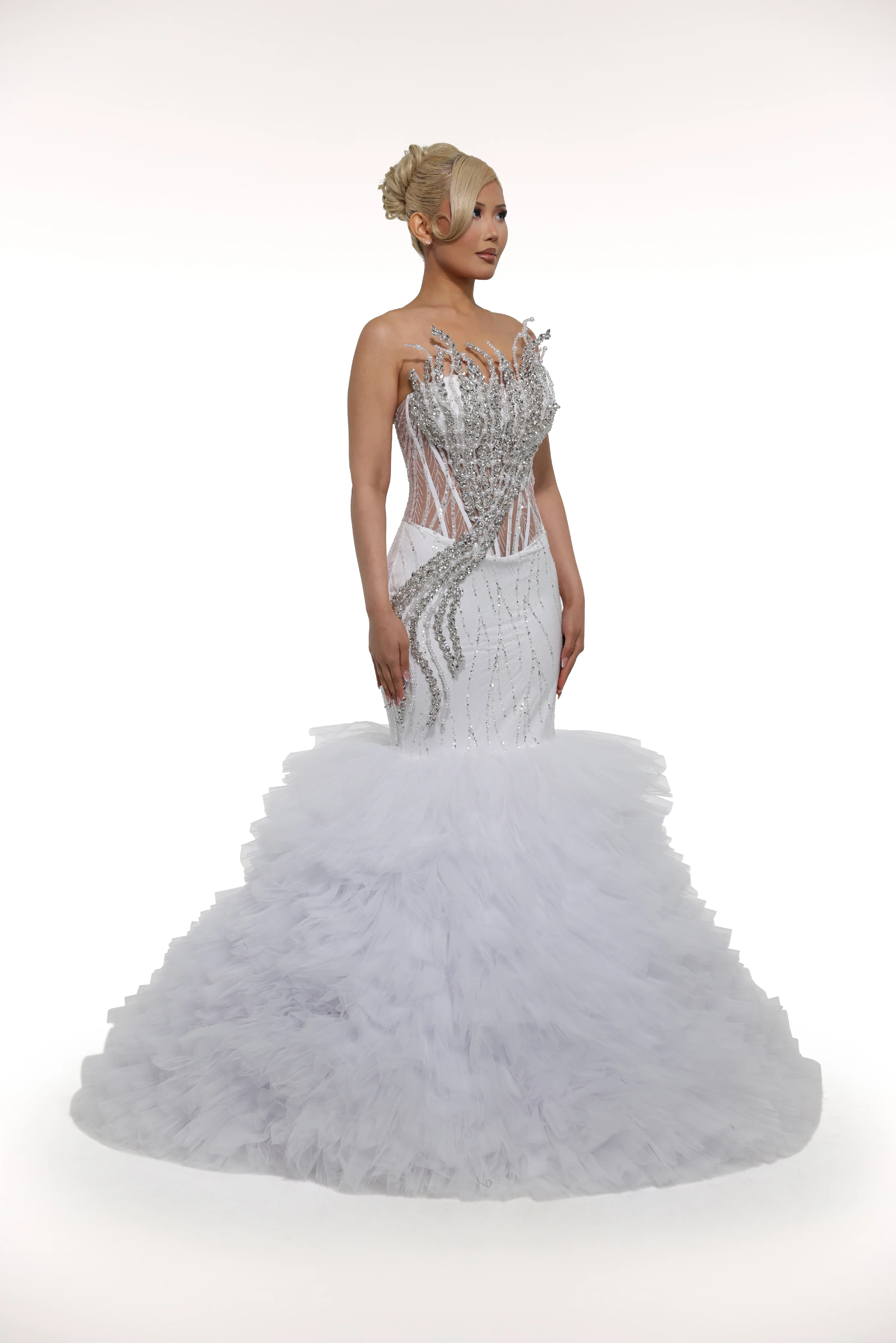 'Esme' captures editorial elegance with a sheer mesh bust adorned with cascading rhinestone appliqué that curves gracefully from the bodice along the right hip. Layered tulle creates movement and dimension throughout the skirt, delivering the volume and texture essential to formal wear.