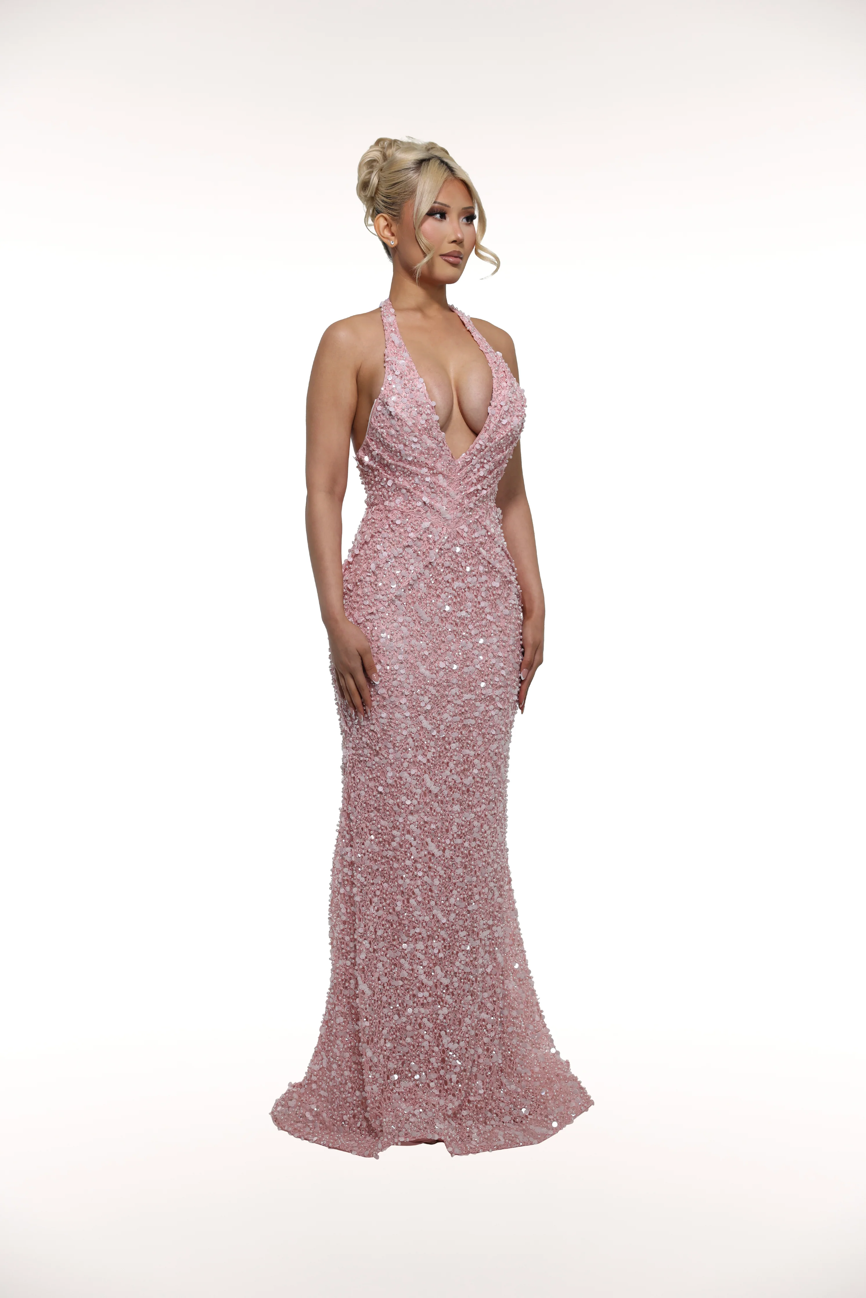 Make an entrance in the 'Libra' gown, where refined lace detailing meets radiant crystal accents. This halter maxi combines timeless elegance with subtle sparkle, designed for those who appreciate understated luxury and effortless sophistication.