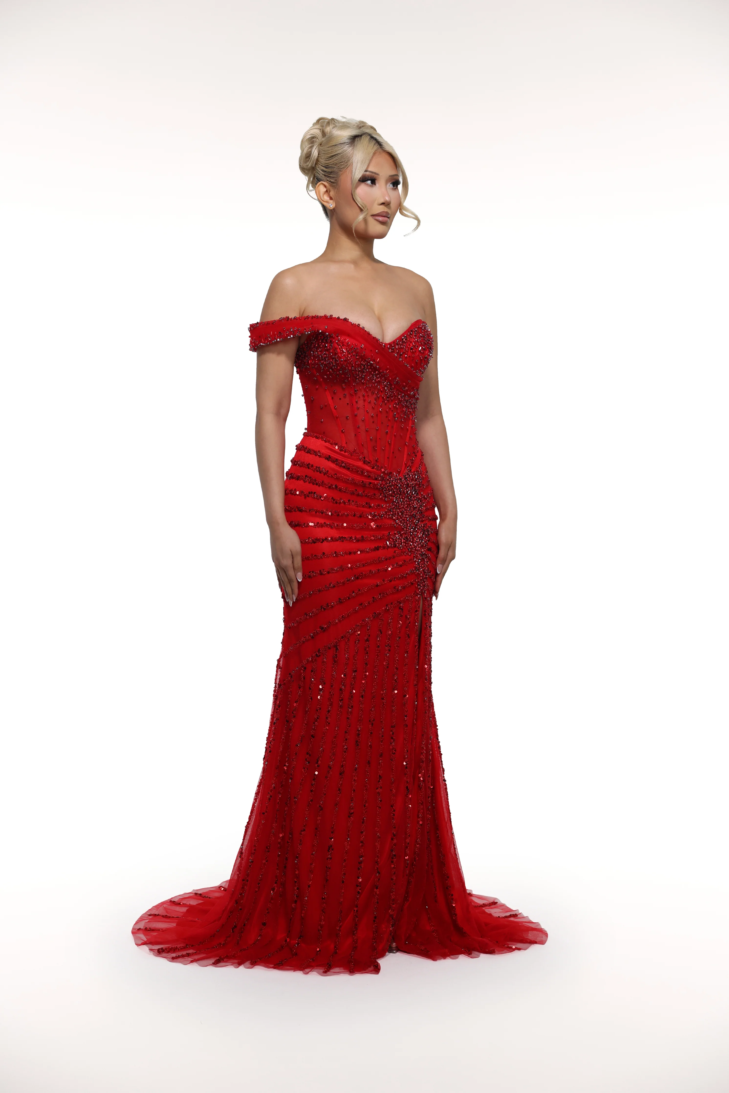 Experience luxury and elegance in our 'Pyrah' gown. The long red gown features a stunning one-shoulder design, adorned with matching crystals and rhinestones for a touch of glamour. Complete with a stylish slit on the left leg, this gown is perfect for any formal occasion.