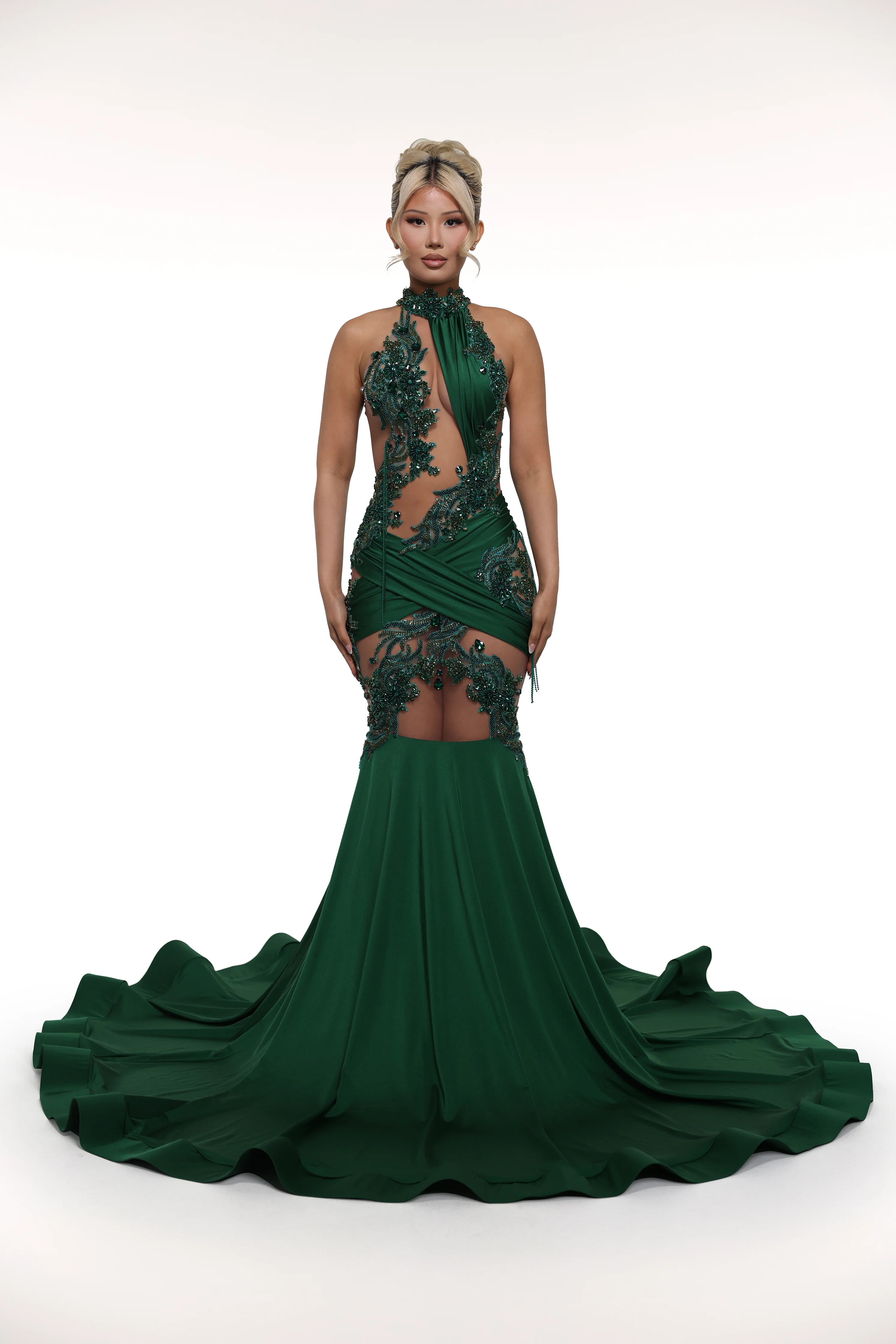 The 'Yves' high-neck gown features adaptive stretch construction for graceful movement and comfort. Luminous rhinestone embellishments frame the bodice and hip with refined elegance, while delicate mesh inserts provide contemporary visual interest to this prom essential.