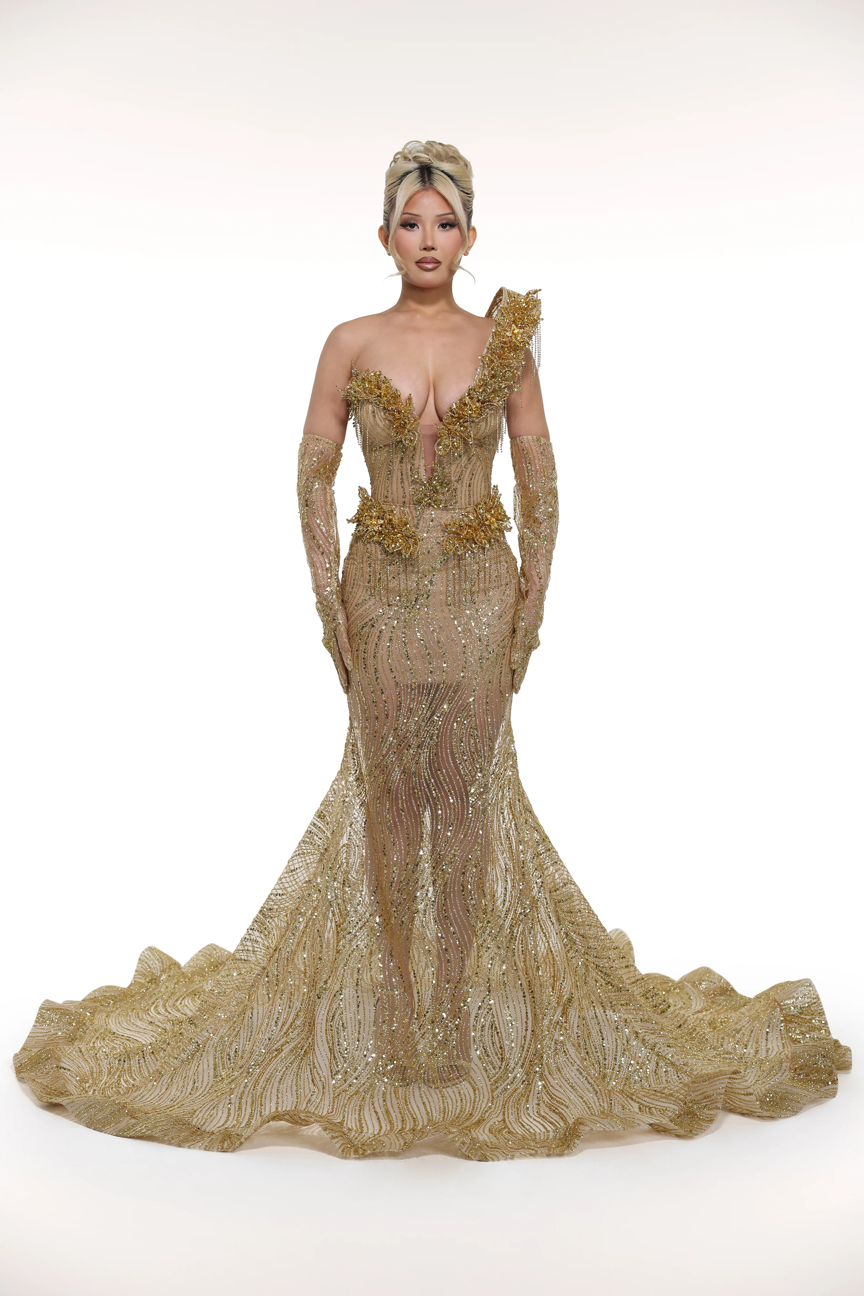 'Zenith' captures editorial elegance with a dramatic one-shoulder silhouette adorned with intricate appliqué and glitter tulle. Rhinestone embellishments accent the bust and hips, creating dimensional movement and luxury detail. Paired with matching elbow-length gloves, this gown delivers a complete, high-impact evening look for the discerning wearer.