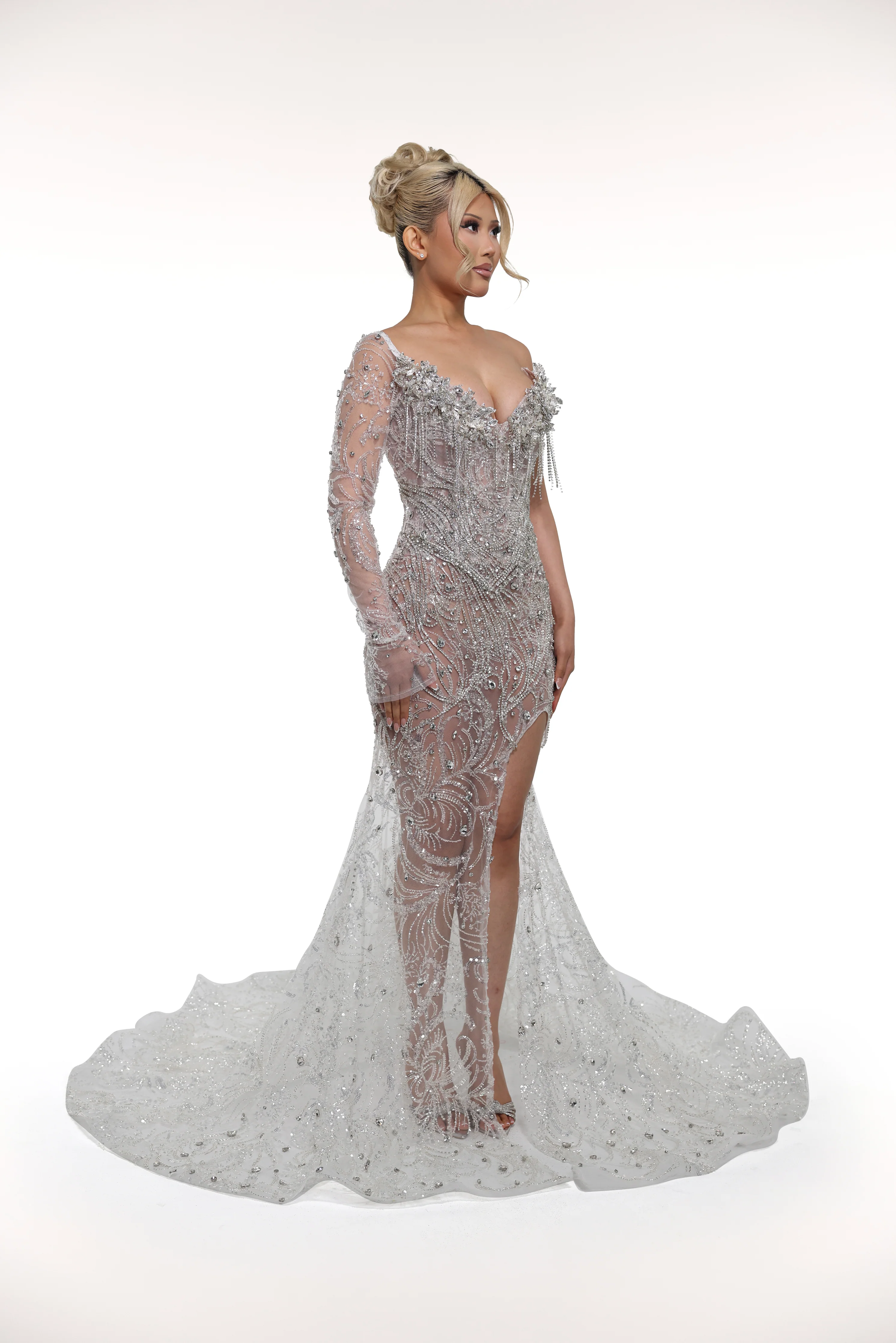 The 'Glisten' gown features a striking one-sleeve silhouette with a deep V neckline, crafted from a glittering fabric that catches the light beautifully. An embellished bust accentuates the waist, creating a flattering and elegant shape. With its stunning design, intricate detailing, and side slit, this gown is made to make you feel effortlessly glamorous at any special event